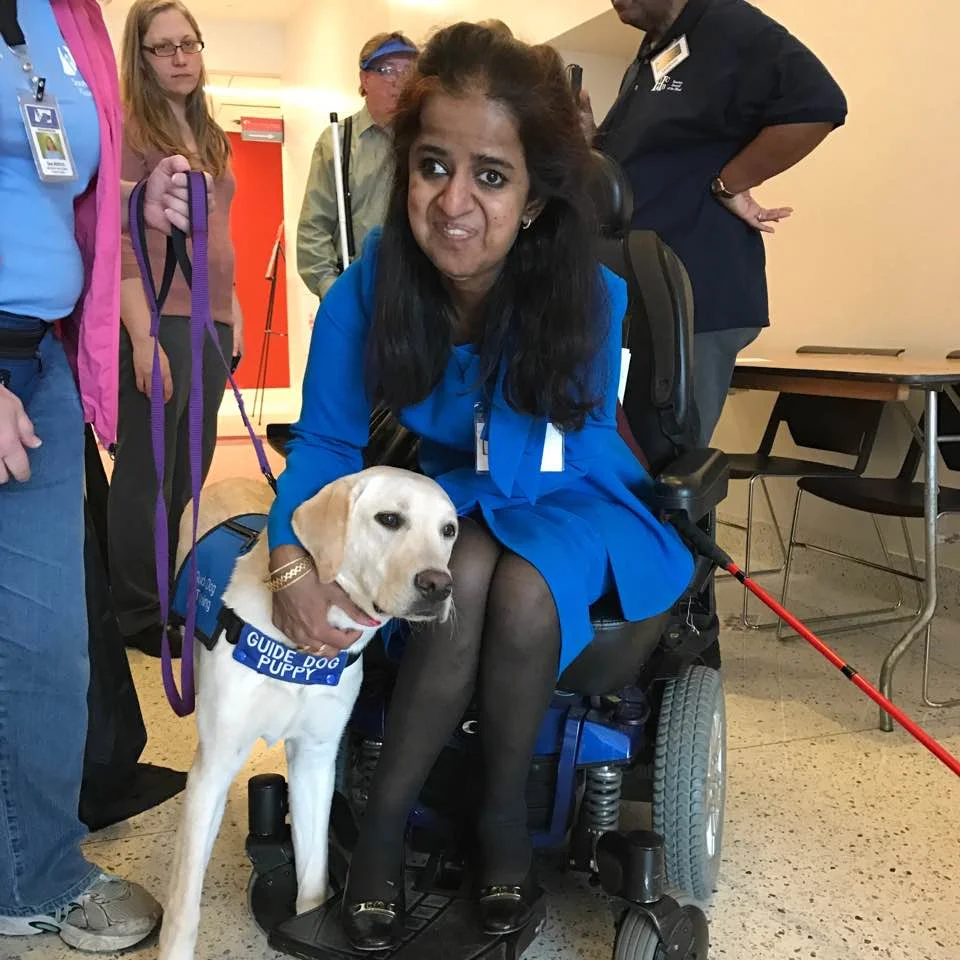 Sandhya, who gave the Keynote Address at the Insight Expo, giving some love to one of the guide dog puppies in the Exhibition Hall.